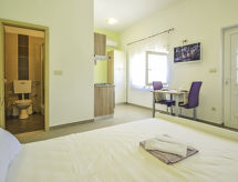1-rums-bungalow 30 m2, sydvästläge. Studio med 1 fransk säng (160 cm, längd 200 cm), sat-TV (flatscreen TV). Utgång till terrassen. Öppet kök (4 kokplattor, ugn, frys, elektrisk kaffemaskin) med matbord, luftkonditionering. Dusch/toalett. Terrass. Terrassmöbler. Till förfogande: Internet (Trådlös LAN [WLAN] , gratis). 1 litet husdjur/hund tillåtet.- Utrustning