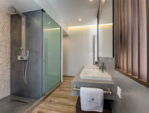 "Anastasia", 5-rums-villa 160 m2. Rymlig och ljus, vackert och modernt inredd: öppet vardagsrum med sat-TV (flatscreen TV). Utgång till trädgården, till swimmingpoolen. 2 dubbelrum, till varje rum hör, 1 dubbelsäng, dusch/toalett och sat-TV (flatscreen TV). 2 dubbelrum, till varje rum hör 2 sängar, dusch/toalett och sat-TV (flatscreen TV). Öppet kök (ugn, 4 kokplattor - glaskeramikhäll, brödrost, vattenkokare, mikrovågsugn, elektrisk kaffemaskin) med matbord. Luftkonditionering. Vacker utsikt på havet. Till förfogande: tvättmaskin, strykjärn, hårtork. Internet (Trådlös LAN [WLAN] , gratis). 1103939- Utrustning