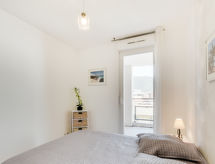 2-rums-lägenhet 41 m2 på 3. våningen. Komfortabelt inredd: vardags-/matrum med 1 bäddsoffa för 2 personer (1 x 140 cm, längd 190 cm), TV (flatscreen TV). Utgång till terrassen. 1 rum med 1 fransk säng (1 x 140 cm, längd 190 cm). Utgång till terrassen. Öppet kök (ugn, diskmaskin, 3 kokplattor - glaskeramikhäll, brödrost, vattenkokare, mikrovågsugn, frys, elektrisk kaffemaskin). Dusch, sep. Toalett. Luftkonditionering, varmluftsuppvärmning. Terrass 10 m2, täckt, norrläge och västläge. Utsikt på landskapet. Till förfogande: tvättmaskin, strykjärn, hårtork. Internet (Trådlös LAN [WLAN] , extra). Parkeringsplats nr 99 (täckt), höjd 240 cm, bredd 240 cm. Notera: brandvarnare. x.- Kännetecken för boendet