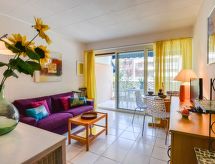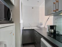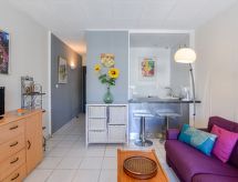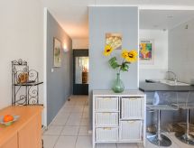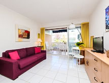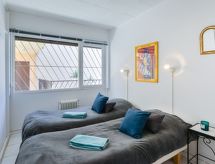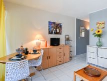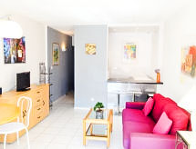 2-rums-lägenhet 36 m2 på 1. våningen. Praktiskt och komfortabelt inredd: vardags-/matrum med TV. Utgång till terrassen. 1 rum med 2 sängar (80 cm, längd 190 cm). Öppet kök (2 kokplattor - glaskeramikhäll, mikrovågsugn, frys). Dusch/toalett. Eluppvärmning. Terrass 6 m2. Terrassmöbler. Till förfogande: tvättmaskin. Internet (Trådlös LAN [WLAN] , extra). Notera: brandvarnare. 06029003926SB- Kännetecken för boendet