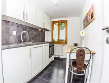 "Bergfink Obergeschoss", 1-rums-studio 27 m2 på 2. våningen. Renoverad år 2013, vackert och mysigt inredd: vardags-/sovrum med 2 skåpsängar och sat-TV (flatscreen TV). Utgång till balkongen, mot söder. Kök (ugn, 4 kokplattor - glaskeramikhäll, elektrisk kaffemaskin) med matbord. Dusch/toalett. Balkong. Vacker utsikt på bergen, landskapet och orten. Till förfogande: Internet (Trådlös LAN [WLAN] , gratis). Parkeringsplats vid huset. Notera: rökfri lägenhet. 1 husdjur/hund tillåtet.- Utrustning