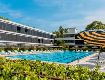 "Bilo Standard", 2-rums-lägenhet 38 m2, på övervåningen. Praktiskt och modernt inredd: vardags-/sovrum med 1 bäddsoffa, matbord, digital-TV, flatscreen TV, eluppvärmning och luftkonditionering. Utgång till verandan. 1 dubbelrum. Öppet kök (4 Induktionshäll, mikrovågsugn, elektrisk kaffemaskin, Kapslar till kaffemaskin (Nescafe Dolce Gusto)). Dusch/bidé/toalett. Balkong 7 m2. Balkongmöbler. Utsikt på swimming-poolen. Till förfogande: hög barnstol, barnsäng för barn under 2 år (extra), hårtork. Internet (Trådlös LAN [WLAN] , gratis). Notera: max 1 husdjur/hund tillåtet. Brandsläckare.- Kännetecken för boendet