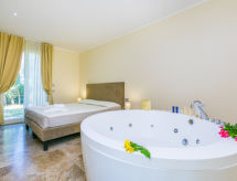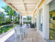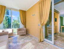 4-rums-hus 84 m2, på bottenvåningen. Modernt och stiligt inrett: vardags-/matrum med matbord och sat-TV. 1 dubbelrum med badkar och bubbelbad. 1 rum med 2 sängar. Vardagsrum med 1 bäddsoffa för 2 personer. Kokvrå (diskmaskin, 4 kokplattor - glaskeramikhäll, brödrost, vattenkokare, elektrisk kaffemaskin, kombinerad mikrovågsugn). Dusch/bidé/toalett. Eluppvärmning (extra), luftkonditionering (extra). Trädgårdssittplats, trädgård 20 m2. Terrassmöbler. Notera: rökfri lägenhet. 1 husdjur/hund tillåtet.- Kännetecken för boendet