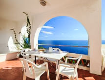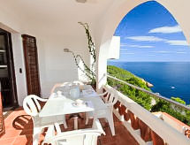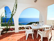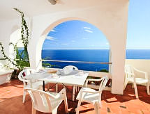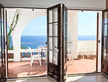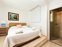 1-rums-lägenhet 50 m2 på 1. våningen. Vackert och modernt inredd: vardags-/matrum 32 m2 med 1 bäddsoffa för 2 personer (135 cm, längd 190 cm), elektriskt värmeelement och vedugn. Utgång till terrassen. Sovalkov med skjutdörr med 1 fransk säng (150 cm), badkar/toalett och elektriskt värmeelement. Kök (ugn, 4 kokplattor - glaskeramikhäll, brödrost, mikrovågsugn, elektrisk kaffemaskin) med serveringsöppning. Terrass 19 m2 täckt. Terrassmöbler. Härlig utsikt på havet. Till förfogande: tvättmaskin, strykjärn, hög barnstol, barnsäng för barn under 2 år, hårtork. Notera: byggnadsarbete 100 m. HUTG000344- Utrustning
