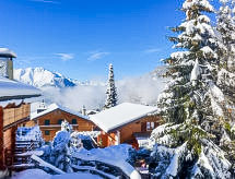 "Boule de Neige", 4-rums-chalet 96 m2 med 3 våningar, sydläge. Komfortabelt och vackert inrett: vardags-/matrum med panoramafönster mot söder med öppen spis, matvrå, kabel-TV och eluppvärmning. Utgång till balkongen, mot söder. Öppet kök (diskmaskin, 4 kokplattor - glaskeramikhäll) med bar. Nedre våning: (spiraltrappa) 1 rum, mot söder med 1 dubbelsäng och dusch/toalett. Utgång till balkongen, mot söder. 2 rum, till varje rum hör 2 sängar. Dusch/toalett, sep. Toalett. Balkong, sydläge. Mycket vacker panoramautsikt på bergen, landskapet och orten. Till förfogande: Internet (Trådlös LAN [WLAN] , gratis). Parkeringsplats (2 Bilar). Notera: rökfri lägenhet. Ingen hiss.- Utrustning