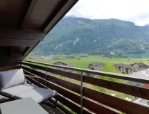 "Brienz Sunset", 3-rums-lägenhet 70 m2, på takvåningen, västläge. Rymlig och ljus, delvis sluttande tak, mycket komfortabelt och mysigt inredd: öppet vardags-/matrum med matbord och kabel-TV. Utgång till balkongen. 1 rum med 1 dubbelsäng (180 cm, längd 200 cm). 1 rum med snedtak med takfönster med 1 fransk säng (160 cm, längd 200 cm). Öppet kök (ugn, 4 kokplattor - glaskeramikhäll, brödrost, vattenkokare, mikrovågsugn, elektrisk kaffemaskin, Kapslar till kaffemaskin (Nespresso) extra, raclettegrill, fondueset (ost )). Dusch/toalett. Parkettgolv. Balkong, västläge. Balkongmöbler. Härlig panoramautsikt på sjön och bergen. Till förfogande: hög barnstol, barnsäng för barn under 2 år (extra), hårtork. Internet (Trådlös LAN [WLAN] , gratis). Notera: rökfri lägenhet.- Kännetecken för boendet