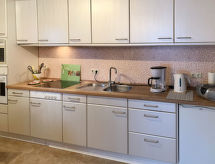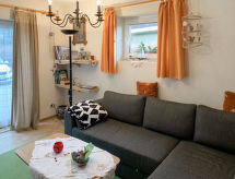 3-rums-lägenhet 62 m2 med 2 våningar, på bottenvåningen. Mysigt inredd: vardags-/matrum 25 m2 med sat-TV (flatscreen TV). Öppet kök (4 kokplattor, ugn, brödrost, vattenkokare, mikrovågsugn, elektrisk kaffemaskin). Dusch/toalett. Övre våning: (brant trappa) 1 rum 15 m2 med 1 dubbelsäng (2 x 90 cm, längd 200 cm). 1 rum 11 m2 med 2 sängar (90 cm, längd 200 cm). Stor terrass. Terrassmöbler, utegrill. Till förfogande: hög barnstol. Notera: rökfritt hus. Brandvarnare.- Utrustning