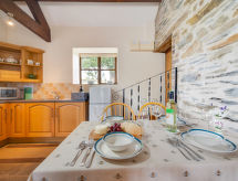 3-rums-stuga. Rymlig och ljus, komfortabelt och smakfullt: öppet vardagsrum med TV, flatscreen TV och DVD. 1 dubbelrum med 1 dubbelsäng. 1 rum med 2 sängar. Öppet kök (4 kokplattor, ugn, mikrovågsugn, frys) med matbord. Dusch/toalett. Uppvärmning. Terrassmöbler, utegrill. Till förfogande: tvättmaskin, torktumlare. Notera: rökfritt hus.- Utrustning