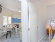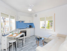 "Calaf", 2-rums-lägenhet 36 m2. Praktiskt och komfortabelt inredd: vardags-/matrum med 1 bäddsoffa för 2 personer (160 cm, längd 200 cm), matbord, digital-TV, internationella TV-kanaler, flatscreen TV, eluppvärmning och fläkt. 1 rum med 1 x 2 våningssängar (90 cm, längd 190 cm), fläkt. Öppet kök (ugn, 4 kokplattor - glaskeramikhäll). Dusch/bidé/toalett. Utsikt på havet. Till förfogande: strykjärn. Internet (Trådlös LAN [WLAN] , gratis). Parkeringsplats (inhägnad, 1 Bil). HUTT051813- Utrustning