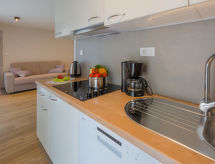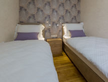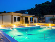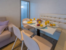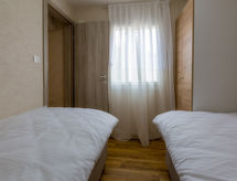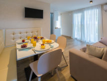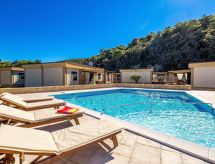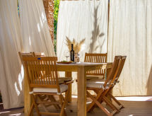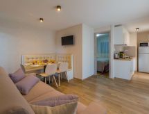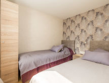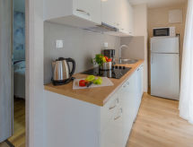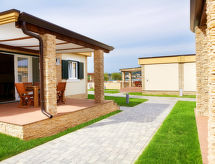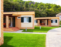 "Standard", 3-rums-hus 40 m2. Vardags-/matrum med 1 bäddsoffa för 2 personer (160 cm, längd 200 cm), sat-TV (flatscreen TV), luftkonditionering. Utgång till terrassen. 1 rum med 1 fransk säng (160 cm, längd 200 cm), dusch/toalett. 1 rum med 2 sängar (90 cm, längd 200 cm). Öppet kök (diskmaskin, 2 kokplattor - glaskeramikhäll, mikrovågsugn, frys). Dusch/toalett. Terrass 20 m2. Terrassmöbler. Till förfogande: hårtork. Internet (Trådlös LAN [WLAN] , gratis).- Utrustning