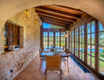 Costitx: Stor, mycket vacker, mysig villa "Can Gall", omgiven av träd och fält. Utanför orten Costitx, lugnt, soligt läge, 27 km från havet, 27 km från stranden, i det gröna. För privat bruk: med gräsmatta och planteringar, fruktträdgård, gräsplan, vacker trädgård för avkoppling, pool kantig (12 x 6 m, 220 cm djup, tillgång säsongsbunden: 01.Jan. - 31.Dec.). Utedusch, tennis (1 x hårdbeläggning), sittplats, berså, pergola, trädgårdsmöbler, utegrill. I huset: internetanslutning, Trådlös LAN [WLAN], centralvärme, luftkonditionering, tvättmaskin, torktumlare. Parkering vid huset på tomten. Affär 2.5 km, livsmedelsaffär 2.5 km, stormarknad 8 km, restaurang 8 km, bar 2.5 km, bageri 2.5 km, café 2.5 km, internetcafé 8 km, cykeluthyrning 9 km, ölservering 2.5 km, sandstrand "Can Picafort" 27 km. Sporthamn 35 km, marina 35 km, golfbana (18 hål) 38 km. Närbelägna sevärdheter: Finca Son Bordils (Vineyards) 7 km, Mallorca Planetarium 3 km, Museo de Ciencia Natural. Notera: fordon rekommenderas. Lämplig för barnfamiljer, passande för äldre babyutrustning på förfrågan (inkl.). Objekt passande för 8 vuxna. Ägaren accepterar inga ungdomsgrupper. Av- och pålastning av bagage är möjligt vid semesterbostaden. Flygplats 30 km från huset. Två kattungar bor utanför huset och vi har mat till dem i huset. Tennisbana (20x40) är tävlingsstorlek.Interior