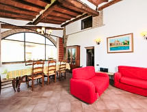 "Capanna", 4-rums-hus 110 m2 med 2 våningar. Komfortabelt och rustikt inrett: stort vardagsrum 28 m2 med panoramafönster med 1 bäddsoffa för 2 personer och TV (flatscreen TV). Kombinerat kök och vardagsrum (4 kokplattor, ugn, diskmaskin, frys) med matbord. Utgång till trädgården. Dusch/bidé/toalett. Övre våning: 1 dubbelrum med fläkt. 1 rum med 2 sängar och fläkt. Dusch/bidé/toalett. Gräsmatta. Terrassmöbler, sittgrupp. Till förfogande: tvättmaskin. Internet (Trådlös LAN [WLAN] , gratis). 1 husdjur/hund tillåtet.- Utrustning