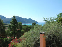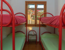 4-rums-lägenhet 100 m2, på övervåningen. Ljus, praktiskt och komfortabelt inredd: vardagsrum med öppen spis, sat-TV, radio och CD. Utgång till balkongen. 1 rum med 1 dubbelsäng och dusch/bidé/toalett. 1 rum med 2 x 2 våningssängar. 1 rum med 1 dubbelsäng. Stort kokvrå (ugn, diskmaskin, mikrovågsugn, frys, elektrisk kaffemaskin). Badkar/bidé/toalett. Terrass. Balkongmöbler, utegrill. Begränsad utsikt på havet. Till förfogande: tvättmaskin, hårtork. Notera: rökfri lägenhet.- Kännetecken för boendet