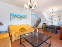 "Casa del Sol", 5-rums-radhus 182 m2 med 2 våningar. Enkelt och praktiskt inrett: vardags-/matrum med digital-TV och luftkonditionering. Utgång till terrassen med dusch/toalett. Kök (ugn, 4 kokplattor - glaskeramikhäll, brödrost, vattenkokare, mikrovågsugn, frys, elektrisk kaffemaskin). Ingen uppvärmningsmöjlighet. Övre våning: 1 rum med 2 sängar (90 cm, längd 190 cm), luftkonditionering. 1 rum med 2 sängar (90 cm, längd 190 cm), luftkonditionering. 1 rum med 2 sängar (90 cm, längd 190 cm), luftkonditionering. 1 rum med 1 fransk säng (150 cm, längd 190 cm), luftkonditionering. 2 badkar/toaletter. Till förfogande: tvättmaskin, strykjärn, hög barnstol, barnsäng, hårtork. Internet (Trådlös LAN [WLAN] , gratis). VFT/GR/05884- Aktiviteter i närheten