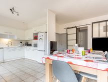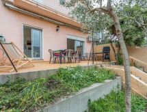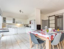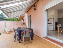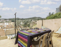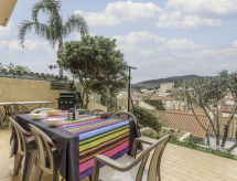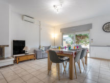 5-rums-radhus 95 m2. Vardags-/matrum med TV (flatscreen TV). Utgång till terrassen. 1 rum med 1 fransk säng (1 x 160 cm, längd 200 cm). Stort, öppet kök (ugn, diskmaskin, 4 gasflammor, brödrost, vattenkokare, mikrovågsugn, elektrisk kaffemaskin). Dusch, sep. Toalett. Eluppvärmning, luftkonditionering. Övre våning: ingång. 2 rum, till varje rum hör, 1 fransk säng (1 x 160 cm, längd 200 cm). 1 rum med 2 sängar (90 cm, längd 190 cm). Badkar, sep. Toalett. Luftkonditionering. Terrass 26 m2, trädgårdssittplats 60 m2. Terrassmöbler. Till förfogande: tvättmaskin. Internet (Trådlös LAN [WLAN] ). Garage. Notera: brandvarnare.- Aktiviteter i närheten