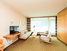 1-rums-lägenhet 28 m2 på 4. våningen. Enkelt och praktiskt inredd: vardags-/matrum med 2 skåpsängar och kabel-TV (flatscreen TV), radio. Utgång till balkongen. Kokvrå vid ingången (2 kokplattor). Sittbadkar/toalett. Balkong 8 m2, sydläge. Vacker utsikt på bergen, landskapet och orten. Parkeringsplats. Notera: rökfri lägenhet.- Kännetecken för boendet