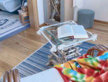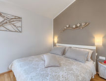4-rums-ena hälften av ett parhus 100 m2 med 2 våningar på 1. våningen. Vardags-/matrum med sat-TV (flatscreen TV), luftkonditionering. Utgång till terrassen. Öppet kök (4 kokplattor, ugn, diskmaskin, mikrovågsugn, frys, elektrisk kaffemaskin). Dusch/toalett. Övre våning: ingång med luftkonditionering. 1 rum med 1 fransk säng (160 cm, längd 200 cm), badkar/bidé/toalett, bubbelbad och luftkonditionering. 1 rum med 1 fransk säng (160 cm, längd 200 cm), dusch/toalett och luftkonditionering. Varmluftsuppvärmning. Terrass 20 m2, täckt. Terrassmöbler, vilstolar. Utsikt på trädgården. Till förfogande: tvättmaskin, kassaskåp, barnsäng, hårtork. Internet (Trådlös LAN [WLAN] , gratis). På bottenvåningen (separat, extern ingång): spa-område (extra), relaxrum.- Kännetecken för boendet