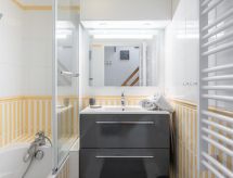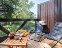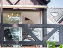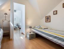 3-rums-lägenhet 45 m2 på 1. våningen. Komfortabelt inredd: vardags-/matrum med 1 bäddsoffa för 2 personer (140 cm, längd 190 cm), TV (flatscreen TV). Utgång till balkongen. Öppet kök (diskmaskin, 3 Induktionshäll, brödrost, vattenkokare, mikrovågsugn, elektrisk kaffemaskin). Badkar, sep. Toalett. Eluppvärmning. Övre våning: 1 rum med 1 fransk säng (1 x 140 cm, längd 190 cm). 1 rum med 2 sängar (90 cm, längd 190 cm). Stor balkong 5 m2, sydläge. Balkongmöbler. Till förfogande: tvättmaskin. Internet (Trådlös LAN [WLAN] , gratis). Parkeringsplats nr 51 & 53. 1 husdjur/hund tillåtet.- Utrustning