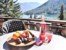 "Colline 7", 3-rums-takvåning 70 m2. Ljus, komfortabelt och vackert inredd: vardags-/matrum med öppen spis och TV. Utgång till balkongen. 2 rum, till varje rum hör, 1 fransk säng (1 x 160 cm, längd 200 cm). Öppet kök (3 kokplattor, ugn, diskmaskin, fondueset (ost )). Badkar/toalett. Liten balkong. Balkongmöbler. Härlig utsikt på sjön, bergen och orten. Till förfogande: Internet (Trådlös LAN [WLAN] , gratis). Parkeringsplats vid huset. Notera: rökfri lägenhet.- Utrustning