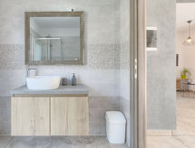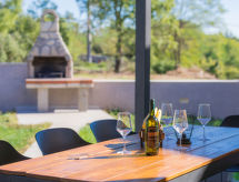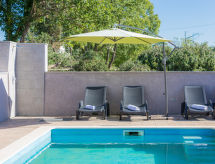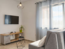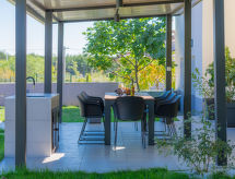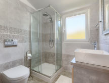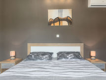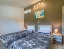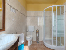 6-rums-hus 150 m2 med 2 våningar. Vardags-/matrum med köksblock, sat-TV och luftkonditionering. 1 rum med 2 sängar (80 cm, längd 190 cm). 1 rum med 1 fransk säng (180 cm, längd 200 cm), luftkonditionering. Vardags-/matrum med sat-TV och luftkonditionering. Öppet kök (ugn, diskmaskin, 4 kokplattor - glaskeramikhäll, mikrovågsugn, frys, elektrisk kaffemaskin). 2 duschar/toaletter. Övre våning: 1 rum med 1 fransk säng (160 cm, längd 200 cm), luftkonditionering. Utgång till terrassen. 1 rum med 2 sängar (80 cm, längd 200 cm), luftkonditionering. Dusch/toalett. Terrass 8 m2. Terrassmöbler, vilstolar. Till förfogande: barnsäng. Internet (Trådlös LAN [WLAN] , gratis). 1 husdjur/hund tillåtet. Ett hus med vardagsrum / matplats, öppet kök, 2 sovrum på bottenvåningen och tavern med öppen spis, matbord och öppet kök (2 kokplattor) i källaren. Det andra huset med vardagsrum / matplats, öppet kök på bottenvåningen och 2 sovrum på första våningen.- Utrustning