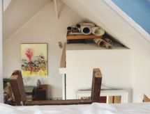 Hus "d'artistes", tillbyggd på ena sidan. 6 km från centrumet av Loctudy, 3 km från centrumet av Lesconil, 9 km från centrumet av Pont l'Abbé, i ett bostadsområde, 70 m från havet. För gemensamt bruk: trädgård. För privat bruk: liten trädgård med planteringar, allmän parkering på gatan. Affär 3 km, stormarknad 5 km, restaurang 700 m, sandstrand "Plage des sables blancs" 70 m, simhall 9 km. Golfbana 27 km, seglarskola 3 km. Närbelägna sevärdheter: Pointe de la Torche 16 km, port du Guilvinec 8 km, phare d'Eckmühl 16 km.Interior
