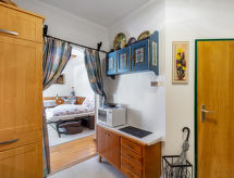 2-rums-lägenhet 42 m2 på 2. våningen. Objekt passande för 2 vuxna + 1 barn. Vackert och mysigt inredd: vardags-/sovrum med 1 bäddsoffa för 2 personer, TV, radio och CD. Utgång till loggian. 1 litet barnrum, utan fönster med 1 x 2 våningssängar. Öppet kök vid ingången (4 kokplattor, ugn, diskmaskin, mikrovågsugn). Dusch/toalett, massage-dusch. Balkongmöbler, loggia. Vacker utsikt på bergen och landskapet. Till förfogande: hårtork. Notera: rökfri lägenhet. Brandvarnare. 50408-000627-2020- Utrustning