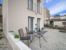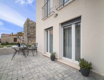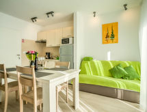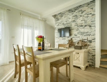 2-rums-ena hälften av ett parhus 50 m2 med 2 våningar. Vardags-/matrum med 1 bäddsoffa för 2 personer (150 cm, längd 190 cm), sat-TV (flatscreen TV), luftkonditionering. Utgång till terrassen. Öppet kök (2 kokplattor - glaskeramikhäll, brödrost, vattenkokare, mikrovågsugn, frys, elektrisk kaffemaskin). Övre våning: 1 rum med 1 fransk säng (160 cm, längd 200 cm), dusch/toalett och sat-TV (flatscreen TV), luftkonditionering. Luftkonditionering, varmluftsuppvärmning. Terrass 7 m2. Terrassmöbler, utegrill. Begränsad utsikt på havet. Till förfogande: hårtork. Internet (Trådlös LAN [WLAN] , gratis).- Utrustning