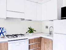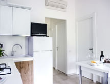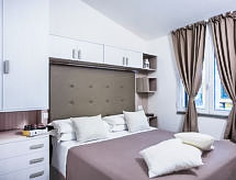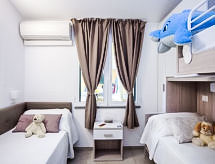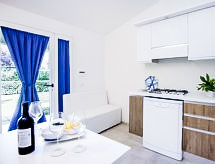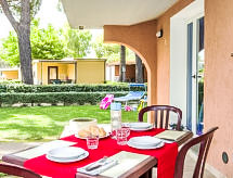 "De Luxe Plus", 3-rums-hus 40 m2, på bottenvåningen. Objekt passande för 4 vuxna + 2 barn. Komfortabelt inrett: vardags-/matrum med sat-TV. Utgång till trädgården, till verandan. 1 dubbelrum. 1 rum med 1 säng och 1 x 2 våningssängar. Kokvrå (4 kokplattor, diskmaskin). Badkar/toalett, dusch/bidé/toalett. Luftkonditionering. Trädgårdssittplats 12 m2, stor trädgård. Terrassmöbler, sittgrupp. Till förfogande: kassaskåp, hårtork. Internet (Trådlös LAN [WLAN] , gratis). Notera: privat entré, privat entré.- Aktiviteter i närheten