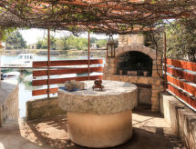 6-rums-hus 150 m2 med 2 våningar. Vardags-/matrum med sat-TV, vedugn och luftkonditionering. Genomgångsrum med 1 dubbelsäng (2 x 80 cm, längd 200 cm), luftkonditionering. Öppet kök (2 kokplattor, ugn, diskmaskin, 4 gasflammor, brödrost, vattenkokare, frys, elektrisk kaffemaskin). Dusch/toalett. Övre våning: 2 rum, till varje rum hör 2 sängar och luftkonditionering. 1 rum med 1 bäddsoffa för 2 personer (160 cm, längd 200 cm), 1 dubbelsäng (2 x 80 cm, längd 200 cm). 1 rum med 1 bäddsoffa (140 cm, längd 200 cm), 1 dubbelsäng (2 x 80 cm, längd 200 cm), luftkonditionering. Badkar/bidé/toalett, sep. Toalett. Terrass 80 m2 täckt. Terrassmöbler, vilstolar, förråd. Utsikt på havet. Till förfogande: barnsäng (extra), ved (gratis). Internet (Trådlös LAN [WLAN] , gratis). Notera: rökfritt hus. Max 2 husdjur/hundar tillåtna.- Kännetecken för boendet