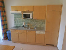 2-rums-lägenhet 40 m2 på 1. våningen. Komfortabelt och smakfullt inredd: 1 stort rum med 1 bäddsoffa för 2 personer, 1 dubbelsäng och sat-TV. Kombinerat kök och vardagsrum (diskmaskin, 2 kokplattor - glaskeramikhäll, mikrovågsugn, elektrisk kaffemaskin) med matvrå. Utgång till balkongen. Dusch/toalett. Balkong, terrass. Terrassmöbler. Vacker utsikt på bergen. Till förfogande: Internet (Trådlös LAN [WLAN] , gratis). Notera: brandvarnare.- Utrustning