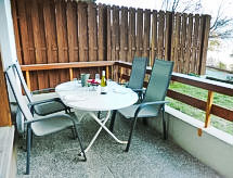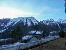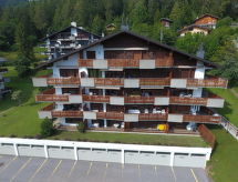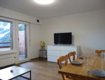 "Domino B 25", 3-rums-lägenhet 40 m2, på bottenvåningen, sydostläge. Komfortabelt och vackert inredd: vardags-/matrum med 1 bäddsoffa för 2 personer (1 x 160 cm, längd 190 cm), kabel-TV. Utgång till balkongen. 1 rum med 1 fransk säng (160 cm). 1 barnrum med 1 x 2 våningssängar. Kokvrå vid ingången (4 kokplattor, ugn, diskmaskin, elektrisk kaffemaskin). Badkar/toalett. Balkong 8 m2, sydläge. Terrassmöbler. Utsikt på bergen. Till förfogande: Internet (Trådlös LAN [WLAN] , gratis). Parkeringsplats nr 25 (täckt, 1 Bil). Notera: rökfri lägenhet. Max 1 husdjur/hund tillåtet. Skidförrådet nr. 32 hör till lägenheten.- Utrustning