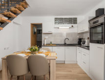3-rums-radhus 80 m2 med 3 våningar. Objekt passande för 4 vuxna + 1 barn. Vackert och modernt inrett: matrum. Öppet kök (ugn, diskmaskin, 4 Induktionshäll, brödrost, vattenkokare, mikrovågsugn, frys, elektrisk kaffemaskin). Dusch/toalett. Övre våning: vardagsrum med 1 bäddsoffa (140 cm, längd 220 cm), sat-TV. Utgång till terrassen. Dusch/toalett. Takvåning: 2 rum med snedtak, takhöjd 150 - 250 cm med takfönster, till varje rum hör, 1 dubbelsäng (2 x 90 cm, längd 200 cm), sat-TV. Varmluftsuppvärmning. Terrass 20 m2, terrass 8 m2. Terrassmöbler. Begränsad utsikt på havet. Till förfogande: kassaskåp, strykjärn, hög barnstol, barnsäng (extra), hårtork. Internet (Trådlös LAN [WLAN] , gratis). Notera: rökfritt hus. Brandsläckare. Max antal personer: 4 vuxna, 1 barn upp till 12 år.- Utrustning