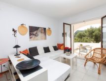 2-rums-lägenhet 46 m2, nedre våningen. Praktiskt och mysigt inredd: vardags-/matrum med matbord, digital-TV och flatscreen TV. Utgång till terrassen. 1 rum med 1 fransk säng (135 cm, längd 190 cm). Öppet kök (4 kokplattor, ugn, brödrost, vattenkokare, elektrisk kaffemaskin). Badkar/toalett. Ingen uppvärmningsmöjlighet. Terrass täckt, sydläge. Balkongmöbler. Mycket vacker utsikt på havet. Till förfogande: tvättmaskin, strykjärn, hårtork. Notera: TV bara ES. HUTG012026- Utrustning