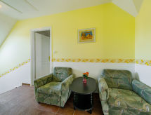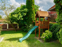 Balatonszárszó: Enfamiljshus "Edina". 750 m från centrumet av Balatonszarszo, 25 km från centrumet av Siofok, soligt läge i ett bostadsområde, 150 m från sjön. För privat bruk: tomt 600 m2 (inhägnad) med gräsmatta och träd, pool (5 x 2 m, 120 cm djup, tillgång säsongsbunden: 15.Maj. - 30.Sep.). Utegrill, barnlekplats (rutschbana, gunga, sandlåda). I huset: alarmanläggning. Till förfogande: cyklar (3) (extra). Parkering (för 2 bilar) på tomten. Affär, restaurang 750 m, grässtrand 150 m. Ägaren accepterar inga ungdomsgrupper.Interior