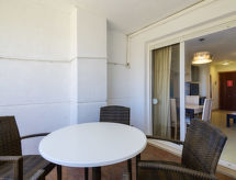"El Cano - Paseo Maritimo", 3-rums-lägenhet 65 m2 på 7. våningen. Praktiskt och komfortabelt inredd: vardags-/matrum med 1 bäddsoffa, matbord, digital-TV, flatscreen TV, luftkonditionering och varmluftsuppvärmning. Utgång till terrassen. 1 rum med 1 fransk säng (135 cm, längd 190 cm), badkar/bidé/toalett. 1 rum med 2 sängar (90 cm, längd 190 cm). Kök (ugn, brödrost, mikrovågsugn, frys, elektrisk kaffemaskin). Badkar/bidé/toalett. Eluppvärmning. Terrass. Terrassmöbler. Vacker utsikt på havet. Till förfogande: tvättmaskin, strykjärn, hårtork. Parkeringsplats nr 45 vid huset. 1 litet husdjur/hund tillåtet. VT-15102-CS- Utrustning