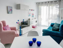 "Élegance", 3-rums-lägenhet 60 m2 på 1. våningen. Vardags-/matrum med sat-TV, digital-TV, luftkonditionering och varmluftsuppvärmning. Utgång till terrassen. 1 rum med 1 fransk säng (150 cm, längd 200 cm). 1 rum med 2 sängar (90 cm, längd 190 cm), badkar/bidé/toalett, luftkonditionering och varmluftsuppvärmning. Utgång till terrassen. Kök (ugn, diskmaskin, mikrovågsugn, frys). Badkar/toalett. Utsikt på swimming-poolen. Till förfogande: tvättmaskin, hög barnstol, barnsäng. Parkeringsplats nr 255 (täckt). 1 husdjur/hund tillåtet. AT-458535-A- Utrustning