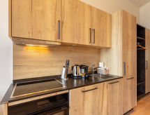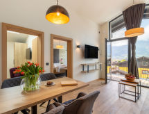 "Top 15/16/14", 3-rums-lägenhet 47 m2 på 2. våningen. Ljus, smakfullt och mysigt inredd: ingång. 2 dubbelrum, till varje rum hör, sat-TV och flatscreen TV. Vardags-/sovrum med 1 bäddsoffa för 2 personer, matvrå, sat-TV och flatscreen TV. Öppet kök (ugn, diskmaskin, 4 Induktionshäll, brödrost, vattenkokare, mikrovågsugn, frys, elektrisk kaffemaskin, Kapslar till kaffemaskin (Nespresso) extra). Dusch/toalett. Golvvärme. Balkong 13 m2. Balkongmöbler. Mycket vacker panoramautsikt på orten. Till förfogande: hårtork. Internet (Trådlös LAN [WLAN] , gratis). Notera: rökfri lägenhet. Hyresobjektet är en boendetyp. 50616-001329-2020- Utrustning
