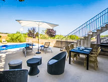 "Es Pujol", 4-rums-ena hälften av ett parhus 160 m2 med 2 våningar. Objekt passande för 6 vuxna. Rymlig och ljus, mycket praktiskt och smakfullt inredd: öppet stort vardags-/matrum med skjutdörr, panoramafönster med matbord, TV, internationella TV-kanaler, flatscreen TV, luftkonditionering och varmluftsuppvärmning. Utgång till trädgårdssittplatsen, till swimmingpoolen. Öppet kök (ugn, diskmaskin, 3 kokplattor - glaskeramikhäll, mikrovågsugn, frys, elektrisk kaffemaskin) med matbord, luftkonditionering och varmluftsuppvärmning. Utgång till trädgårdssittplatsen, till swimmingpoolen. Badkar/toalett eller dusch/toalett. Övre våning: 1 stort dubbelrum med panoramafönster klädkammare med 1 dubbelsäng, badkar/dusch/toalett, dubbelt handfat, luftkonditionering och varmluftsuppvärmning. 1 stort dubbelrum med panoramafönster med 1 dubbelsäng, luftkonditionering och varmluftsuppvärmning. 1 stort dubbelrum med panoramafönster med 2 sängar (90 cm), luftkonditionering och varmluftsuppvärmning. Utgång till balkongen. Badkar/dusch/toalett. Trädgårdssittplats. Terrassmöbler, utegrill, vilstolar. På swimming-poolen, trädgården, landskapet och orten. Till förfogande: tvättmaskin, strykjärn, hårtork. Internet (Trådlös LAN [WLAN] , gratis). Parkeringsplats. Lämpligt för barnfamiljer. ETV5875- Aktiviteter i närheten