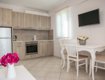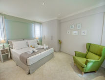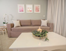 "Executive Suite", 2-rums-lägenhet 50 m2. Komfortabelt och vackert inredd: öppet vardags-/sovrum med 2 bäddsoffor och sat-TV (flatscreen TV). 1 rum med 1 dubbelsäng. Öppet kök (ugn, 4 kokplattor - glaskeramikhäll) med matbord. Dusch/toalett. Luftkonditionering. Balkong eller terrass. Vacker utsikt på swimming-poolen och trädgården. Till förfogande: kassaskåp, strykjärn, hårtork. Internet (Trådlös LAN [WLAN] , gratis). Notera: rökfritt hus. 0831Κ133Κ0521701- Kännetecken för boendet