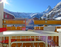 2-rums-lägenhet på 2. våningen. Fullständigt renoverad år 2019, vackert och mysigt inredd: vardags-/matrum med 1 bäddsoffa för 2 personer och TV. Utgång till balkongen. 1 stort dubbelrum med 1 dubbelsäng (180 cm, längd 200 cm). Utgång till balkongen, mot söder. Öppet kök (ugn, diskmaskin, 4 kokplattor - glaskeramikhäll, brödrost, vattenkokare, mikrovågsugn, frys, elektrisk kaffemaskin) med matbord. Dusch/toalett. Balkong, sydläge. Balkongmöbler. Mycket vacker utsikt på the Matterhorn. Till förfogande: hårtork. Internet (Trådlös LAN [WLAN] , gratis). Notera: rökfri lägenhet.- Utrustning