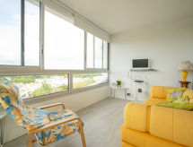 2-rums-lägenhet 34 m2 på 6. våningen. Rymlig och ljus: vardags-/matrum med 1 bäddsoffa (90 cm, längd 190 cm), 1 bäddsoffa för 2 personer (140 cm, längd 190 cm), TV (flatscreen TV), stereoanläggning och DVD. 1 rum med 1 fransk säng (140 cm, längd 190 cm). Kokvrå (4 kokplattor, ugn, diskmaskin, brödrost, vattenkokare, mikrovågsugn, frys, elektrisk kaffemaskin). Badkar, sep. Toalett. Uppvärmning, luftkonditionering. Terrass 20 m2, täckt, västläge. Terrassmöbler. Panoramautsikt på landskapet. Till förfogande: tvättmaskin. Internet (Trådlös LAN [WLAN] , extra). Parkeringsplats. Notera: 1 husdjur/hund tillåtet. Brandvarnare.- Kännetecken för boendet