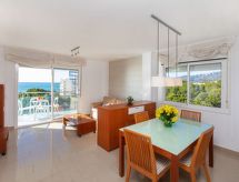 "Gala I", 3-rums-takvåning 70 m2, sydostläge. Rymlig och ljus, praktiskt och komfortabelt inredd: vardags-/matrum med digital-TV och flatscreen TV. Utgång till balkongen. 1 rum med 1 fransk säng (135 cm). 1 rum med 2 sängar (90 cm). Kök (ugn, diskmaskin, 4 kokplattor - glaskeramikhäll, brödrost, vattenkokare, mikrovågsugn, elektrisk kaffemaskin, kombinerad mikrovågsugn). Badkar/bidé/toalett. Luftkonditionering. Ingen uppvärmningsmöjlighet. Balkongmöbler. Panoramautsikt på havet. Till förfogande: tvättmaskin, strykjärn, hårtork. Internet (Trådlös LAN [WLAN] , gratis). Notera: TV bara ES. HUTT008224- Utrustning