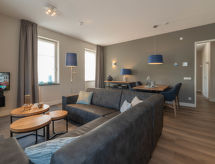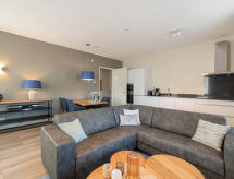 "Raadhuis", 3-rums-lägenhet 66 m2. Komfortabelt inredd: ingång med sep. toalett. Öppet vardags-/matrum med matbord och TV (flatscreen TV), radio och CD. Utgång till balkongen. 2 dubbelrum, till varje rum hör 2 sängar (90 cm, längd 210 cm), TV (flatscreen TV). Öppet kök (4 kokplattor, ugn, diskmaskin, vattenkokare, mikrovågsugn, elektrisk kaffemaskin, Kapslar till kaffemaskin (Nespresso-not incl.)). Dusch/toalett, bubbelbad, Bastu. Golvvärme. Förråd. Till förfogande: hårtork. Internet (Trådlös LAN [WLAN] , gratis). Parkeringsplats (2 Bilar). Notera: rökfritt hus. Brandvarnare.- Utrustning