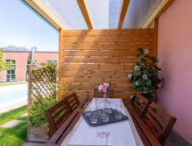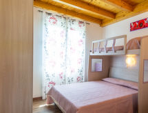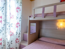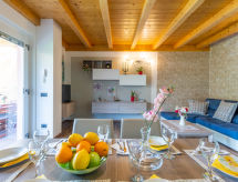 "Gelsomini (CCO522)", 3-rums-radhus 85 m2, på bottenvåningen. Objekt passande för 5 vuxna + 1 barn. Modernt och smakfullt inrett: vardags-/sovrum med 1 bäddsoffa för 2 personer, matbord och sat-TV. Utgång till terrassen. 1 rum med 1 fransk säng (160 cm). Utgång till trädgården. 1 rum med 1 säng (80 cm), 1 x 1 våningssängar (80 cm), 1 fransk säng (160 cm). Öppet kök (ugn, diskmaskin, 4 Induktionshäll, brödrost, frys, elektrisk kaffemaskin). Dusch/toalett. Gasuppvärmning, golvvärme. Terrass 20 m2, trädgård 40 m2. Terrassmöbler, vilstolar (4). Till förfogande: tvättmaskin, hög barnstol, barnsäng. Internet (Trådlös LAN [WLAN] , gratis). Notera: rökfri lägenhet. CIR: 097023-CNI-00118- Utrustning