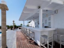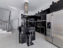 "Gem", 5-rums-villa 250 m2 med 3 våningar. Rymlig och ljus, vackert och modernt inredd: öppet vardags-/sovrum med 1 bäddsoffa för 2 personer, öppen spis, matbord och sat-TV (flatscreen TV). Utgång till trädgården, till swimmingpoolen. 1 dubbelrum med 2 sängar och dusch/toalett. Öppet kök (ugn, diskmaskin, 4 kokplattor - glaskeramikhäll, brödrost, vattenkokare, mikrovågsugn, elektrisk kaffemaskin) med matbord. Luftkonditionering. Övre våning: (stege utan räcke) 1 dubbelrum med 1 dubbelsäng, badkar/toalett och sat-TV (flatscreen TV). Utgång till balkongen. 1 dubbelrum med 1 x 2 våningssängar, dusch/toalett och sat-TV (flatscreen TV). Utgång till balkongen. Luftkonditionering. 2:a våningen (stege utan räcke) 1 dubbelrum med 1 dubbelsäng, badkar/toalett och sat-TV (flatscreen TV). Utgång till balkongen. Luftkonditionering. Stor balkong, 2 små balkonger, stor trädgårdssittplats delvis täckt. Utegrill. Vacker utsikt på havet och landskapet. Till förfogande: tvättmaskin, strykjärn, hårtork. Internet (Trådlös LAN [WLAN] , gratis).- Aktiviteter i närheten