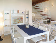 1-rums-hus 70 m2 med 2 våningar, på bottenvåningen. Rymlig och ljus, vackert och mysigt inrett: vardags-/sovrum med 1 bäddsoffa för 2 personer, matbord och sat-TV. Utgång till terrassen. Öppet kök (ugn, 4 gasflammor, frys). Dusch/bidé/toalett. Takvåning: öppet galleri med snedtak med 1 fransk säng (160 cm), eluppvärmning och luftkonditionering. Dusch/bidé/toalett. Terrass 40 m2. Terrassmöbler. Vacker panoramautsikt på havet. Till förfogande: hög barnstol, barnsäng för barn under 2 år. Notera: rökfri lägenhet.- Utrustning