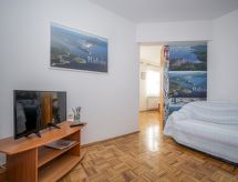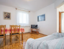 2-rums-lägenhet 75 m2 på 1. våningen. Vardags-/sovrum med 2 sängar (80 cm, längd 200 cm), sat-TV (flatscreen TV). Utgång till terrassen. 1 rum med 1 fransk säng (160 cm, längd 200 cm). Utgång till balkongen. Öppet kök (4 kokplattor, ugn, elektrisk kaffemaskin) med matbord. Dusch/toalett. Uppvärmning (extra). Balkong 3 m2, terrass 10 m2, täckt. Terrassmöbler. Panoramautsikt på havet. Till förfogande: Internet (Trådlös LAN [WLAN] , gratis).- Utrustning