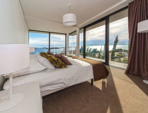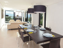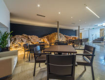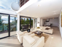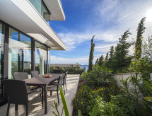 3-rums-lägenhet 100 m2 med 2 våningar, på bottenvåningen. Komfortabelt och modernt inredd: vardags-/matrum 36 m2 med sat-TV (flatscreen TV). Utgång till terrassen. Öppet kök (ugn, diskmaskin, 4 kokplattor - glaskeramikhäll, mikrovågsugn, frys). Sep. Toalett. Övre våning: 1 rum med 1 dubbelsäng (2 x 90 cm, längd 200 cm), sat-TV (flatscreen TV). 1 rum med 2 sängar (90 cm, längd 200 cm), sat-TV (flatscreen TV). Dusch/toalett. Varmluftsuppvärmning. Terrass 35 m2. Begränsad utsikt på havet. Till förfogande: Internet (Trådlös LAN [WLAN] , gratis). Notera: 1 husdjur/hund tillåtet. Brandsläckare.- Utrustning