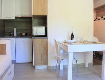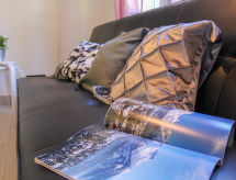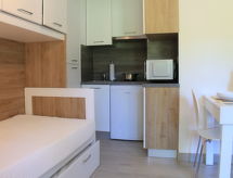 "Grenat 8", 1-rums-lägenhet 23 m2, på bottenvåningen, norrläge. Enkelt och praktiskt inredd: vardags-/sovrum med 2 utdragbara sängar (2 x 90 cm), TV (flatscreen TV). Litet, öppet kök (2 kokplattor - glaskeramikhäll, mikrovågsugn, elektrisk kaffemaskin, Kapslar till kaffemaskin (Nespresso) extra, raclettegrill, fondueset (ost )). Dusch/toalett. Till förfogande: Internet (Trådlös LAN [WLAN] , gratis). Parkeringsplats. Notera: lägenhet mot parkeringsplatsen. Rökfri lägenhet. 1 husdjur/hund tillåtet.- Kännetecken för boendet