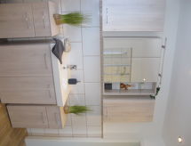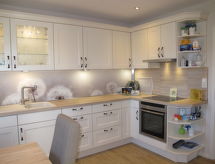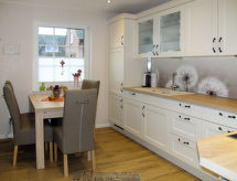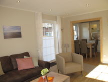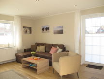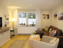 3-rums-lägenhet 75 m2, på bottenvåningen. Modernt och smakfullt inredd: vardagsrum med sat-TV (flatscreen TV), radio och DVD. Utgång till terrassen. 1 rum med 1 dubbelsäng och sat-TV (flatscreen TV). 1 rum med 1 x 2 våningssängar. Öppet kök (ugn, diskmaskin, 4 kokplattor - glaskeramikhäll, brödrost, vattenkokare, mikrovågsugn, elektrisk kaffemaskin) med matbord. Dusch/toalett. Terrassmöbler, utegrill, förråd. Till förfogande: tvättmaskin, torktumlare, hög barnstol, barnsäng. Internet (Trådlös LAN [WLAN] , gratis). Notera: rökfri lägenhet. Brandvarnare.- Utrustning